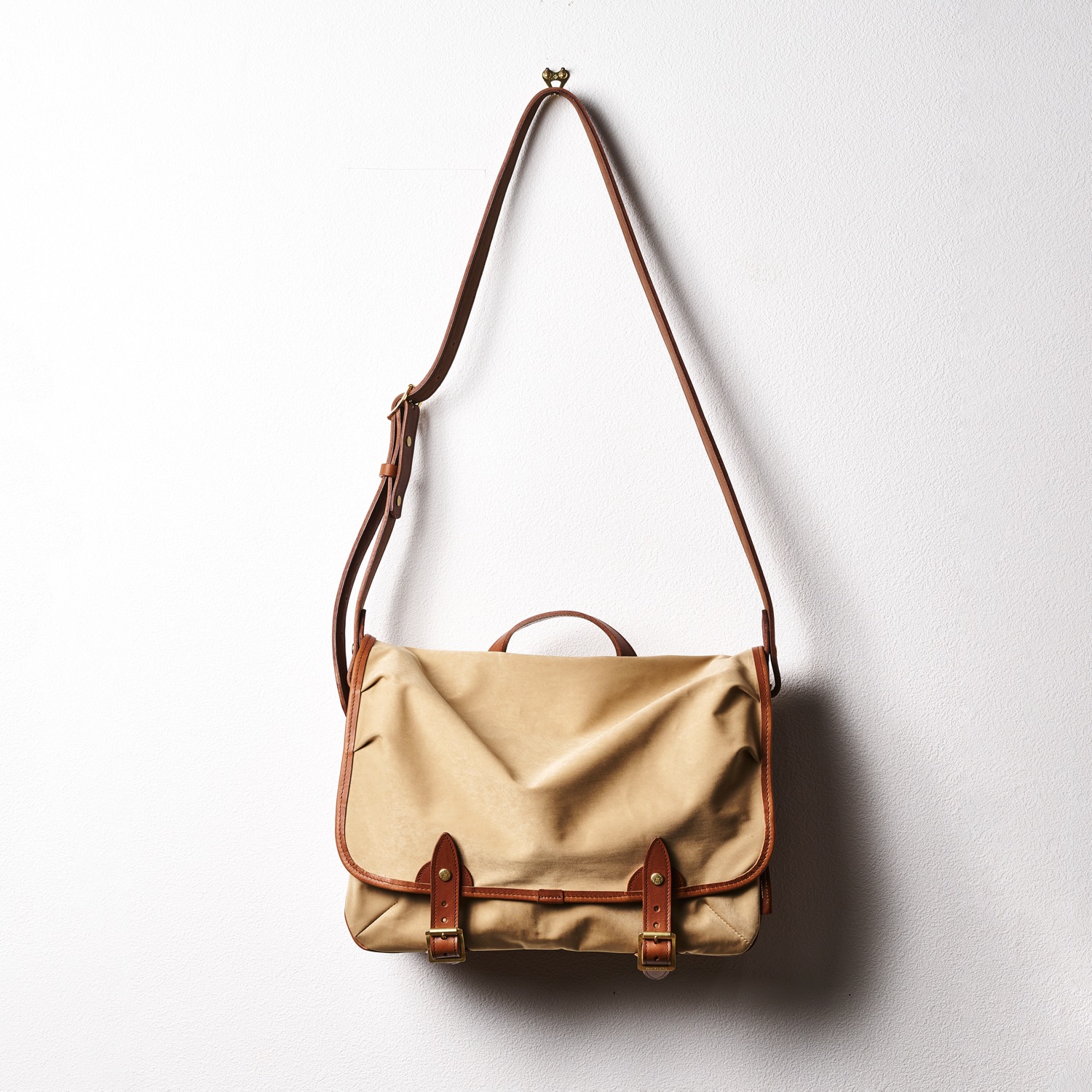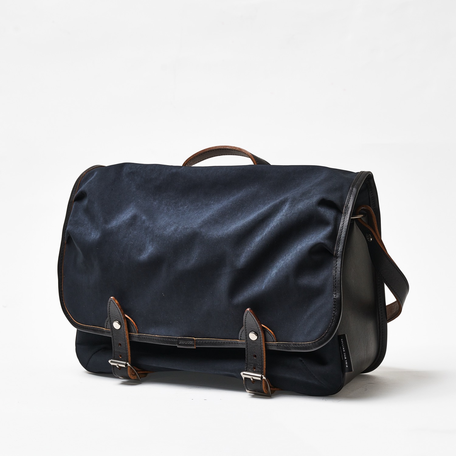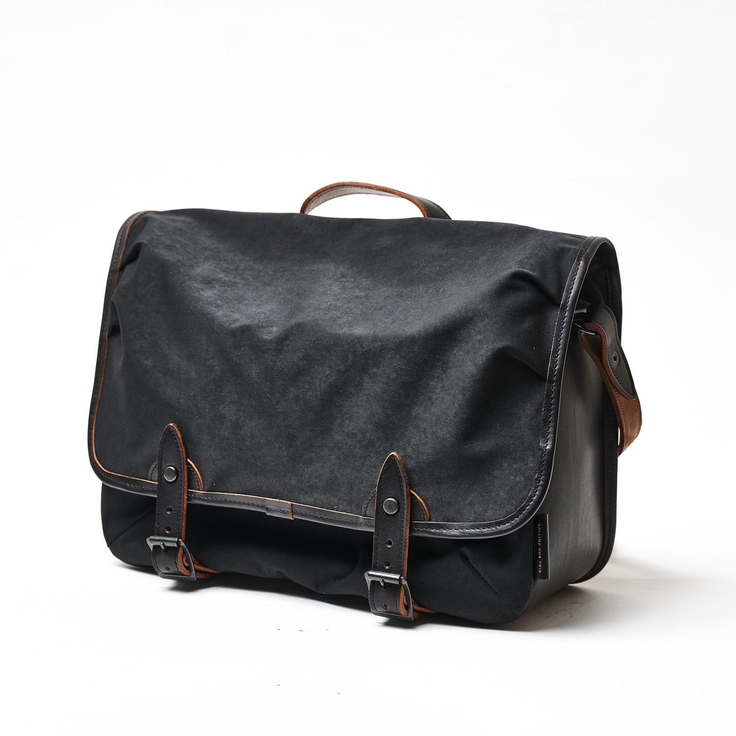 A very handy leather shoulder bag to which A4 size files and documents fit. The right size for business and school use. Materials are Itaalian Vachetta leather and super high density Mili-cloth. These materials go well together and make the bag look sophhisticated while having high level of durability. They both look better when used and worn, making the bag developing the nice patina as it is used.