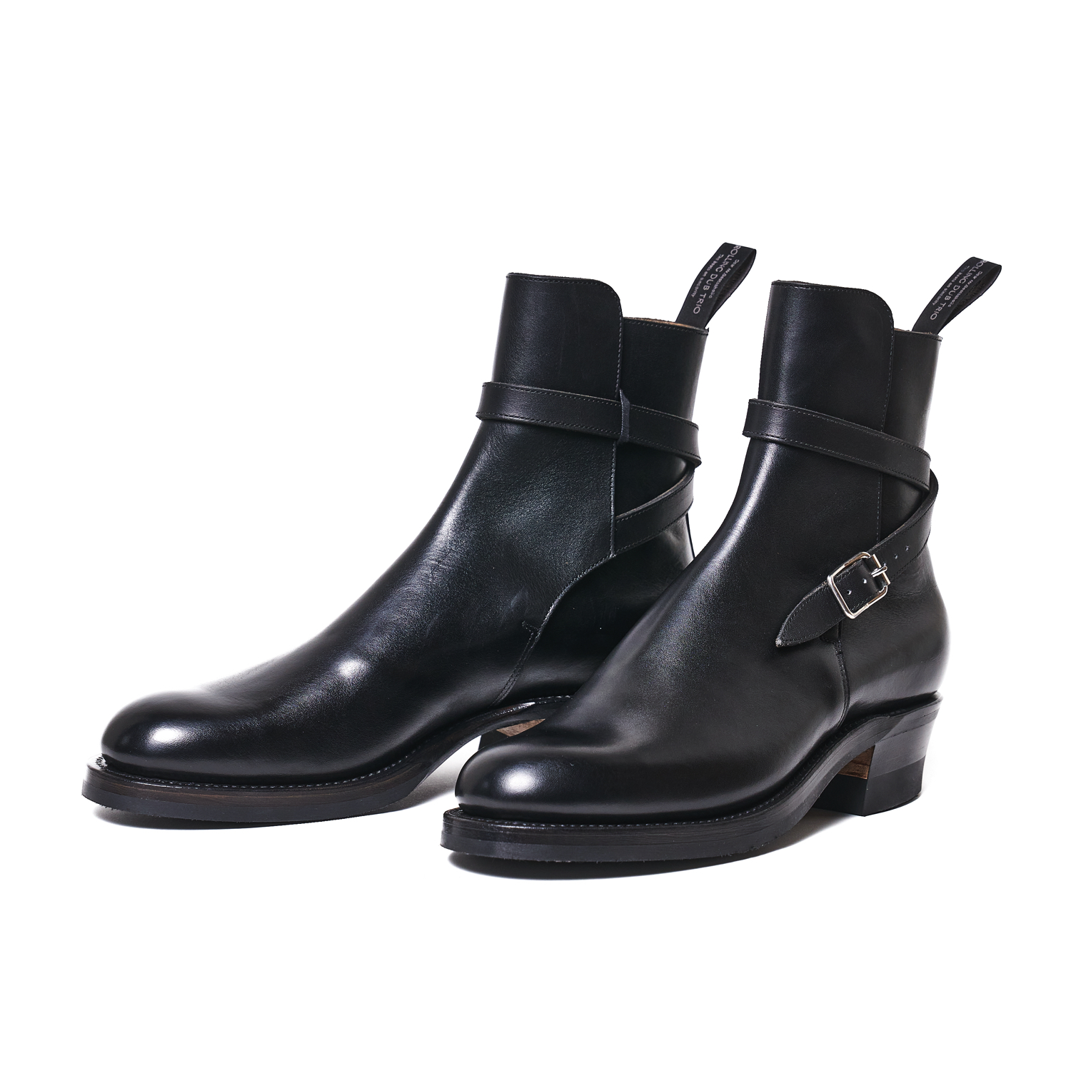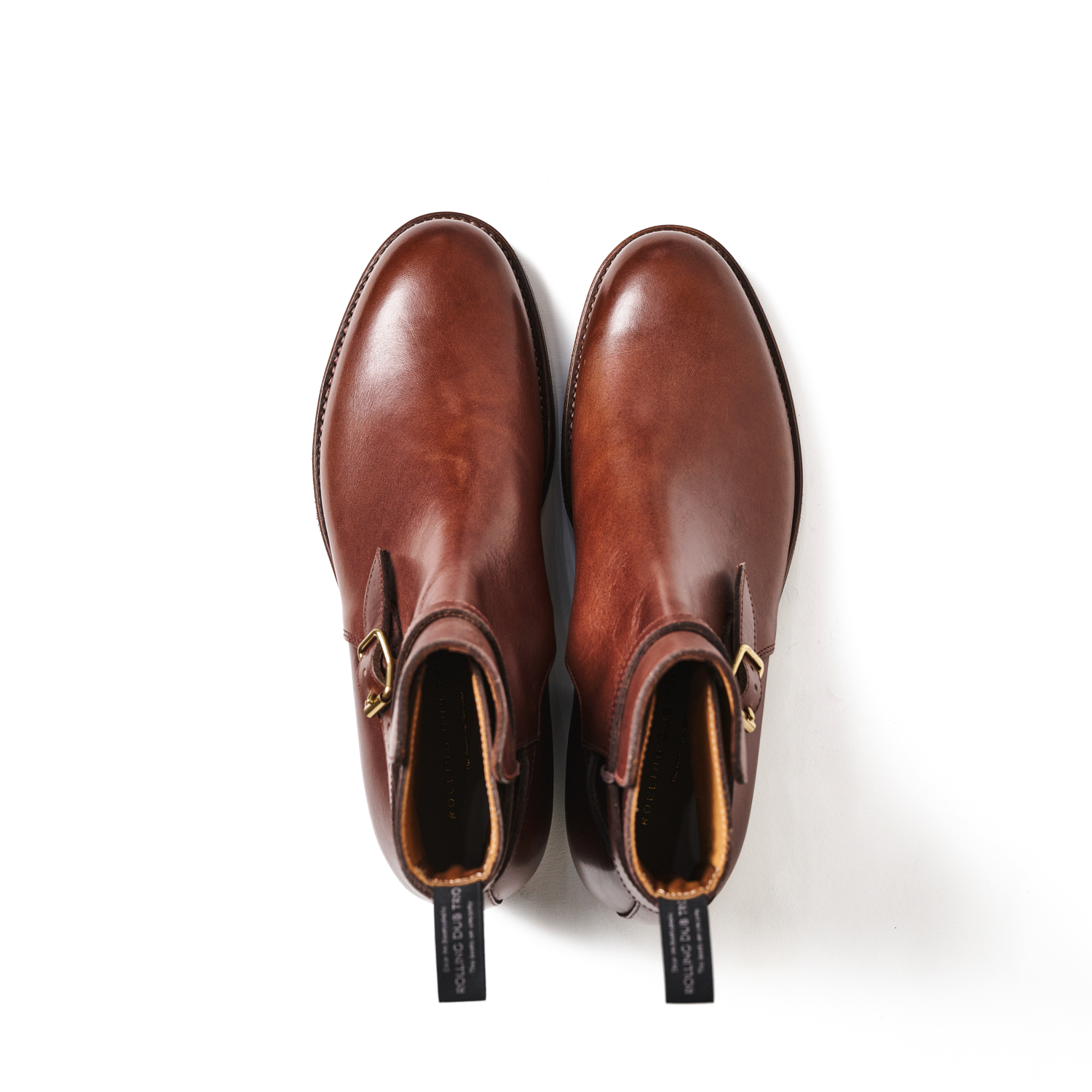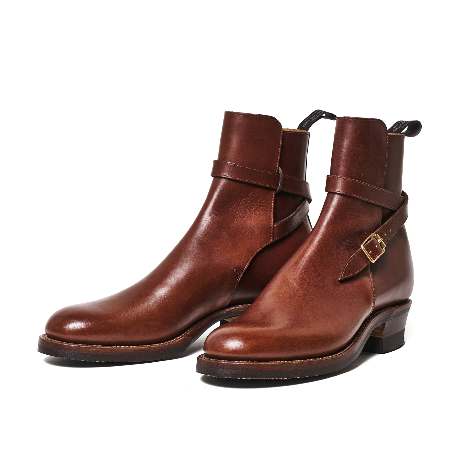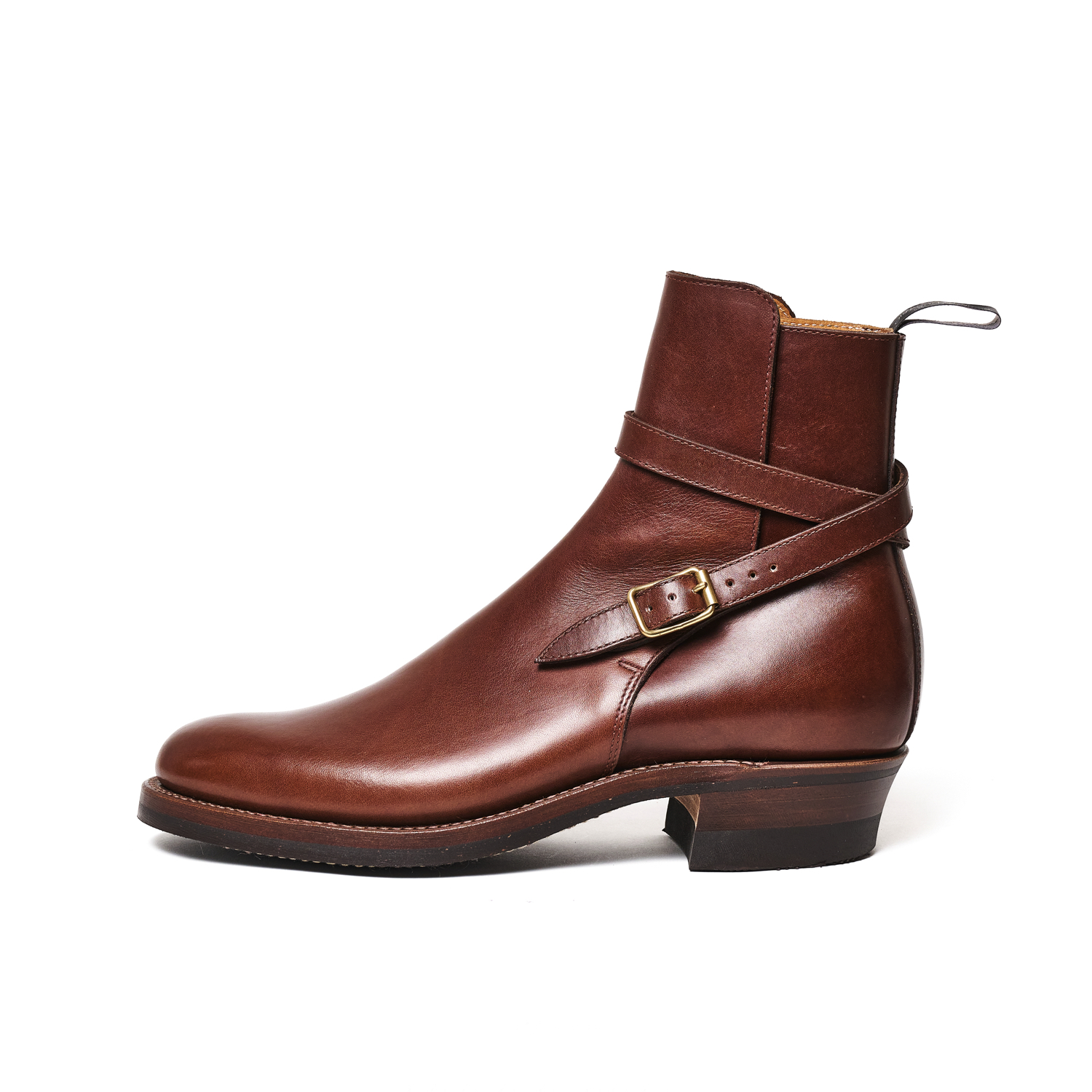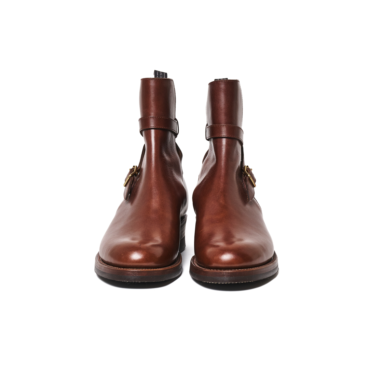 Design --- Jodhpur Boot, which was originally designed for horse back riding in the end of 19th century in England, is a boot filled with functional beauty and class. We make this boot with our original last which was modelled after US Navy last and with Direct Welt construction (stitching upper and welt from thorough the channel on the bottom of insole, and then stitching sole and welt) that enables the boot to have sharp looking. The strap system is also original. The long rectangle buckle is held by short stay on the side that makes putting on and off easy and smooth.
