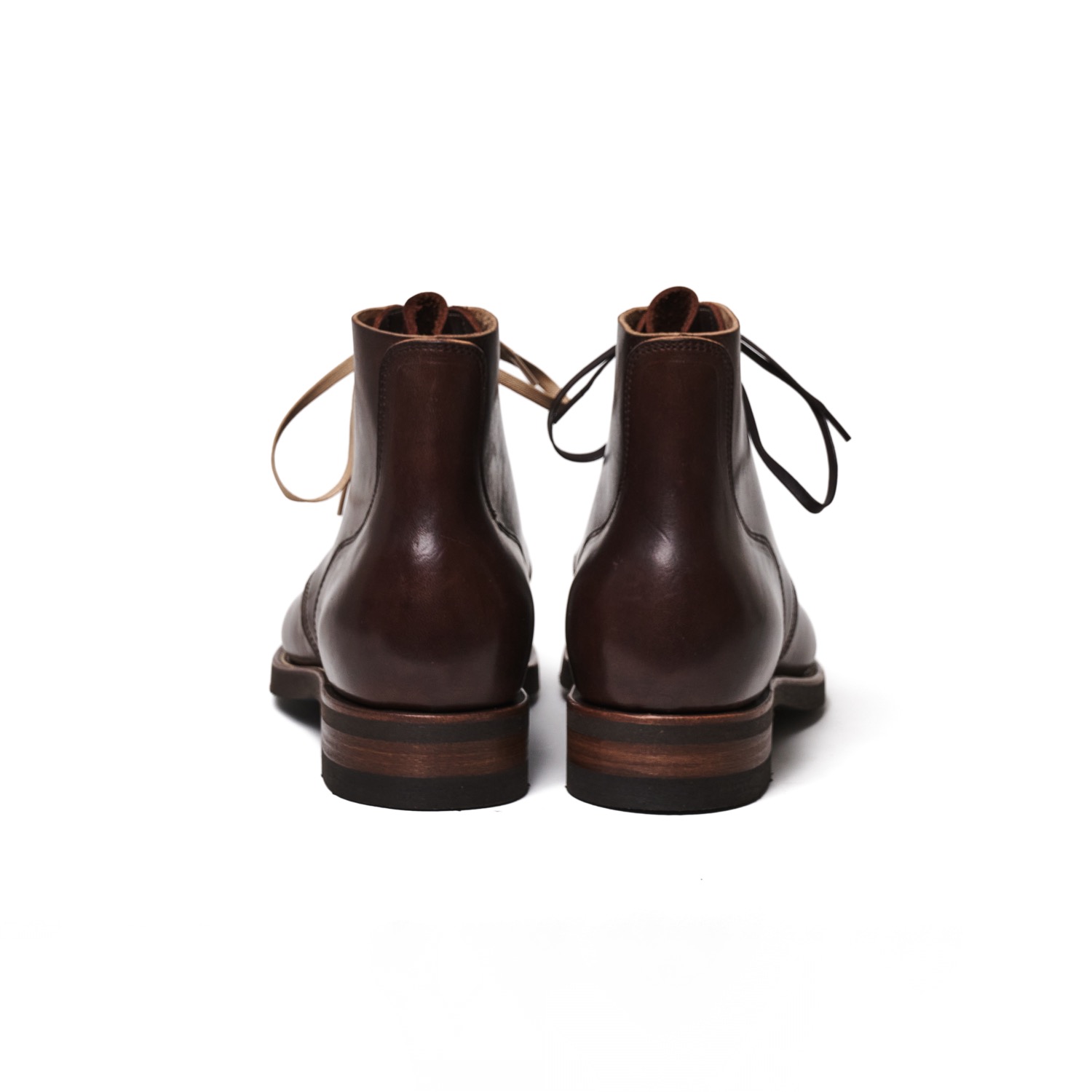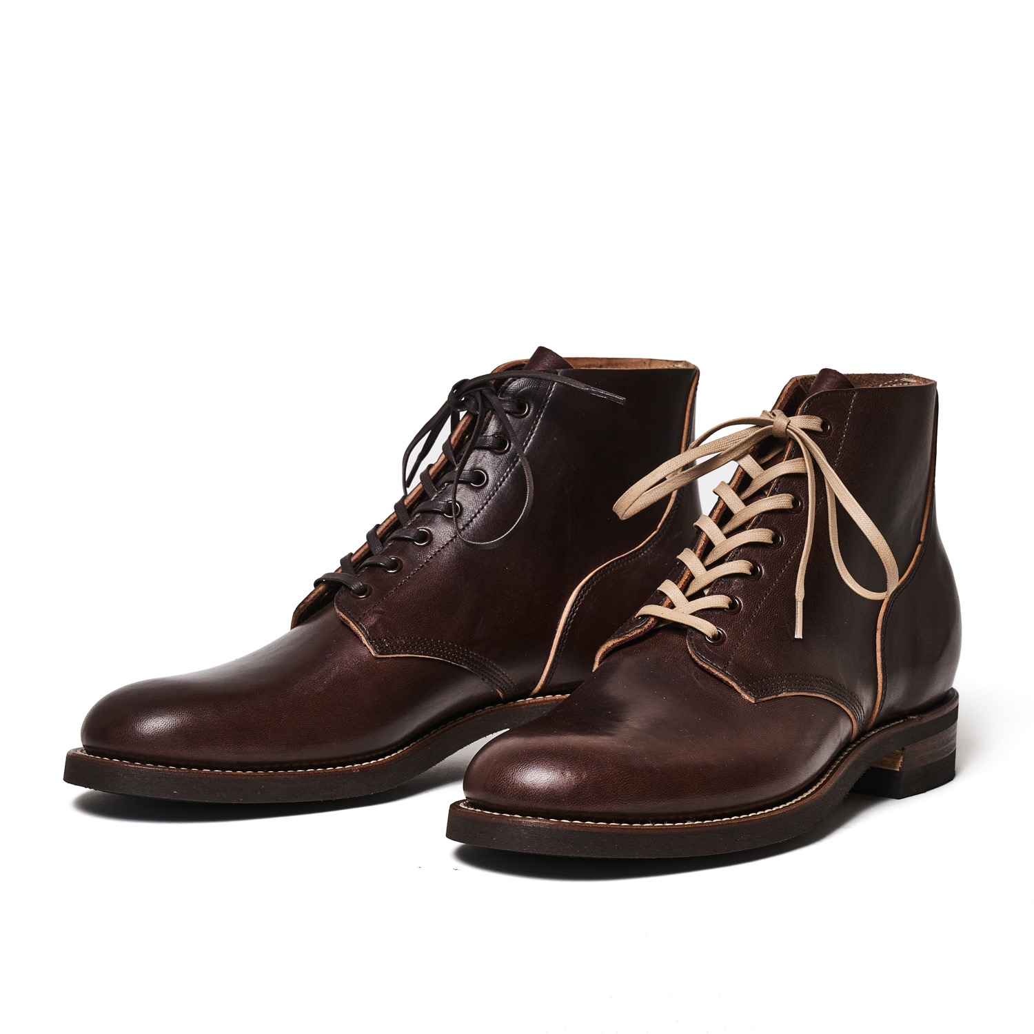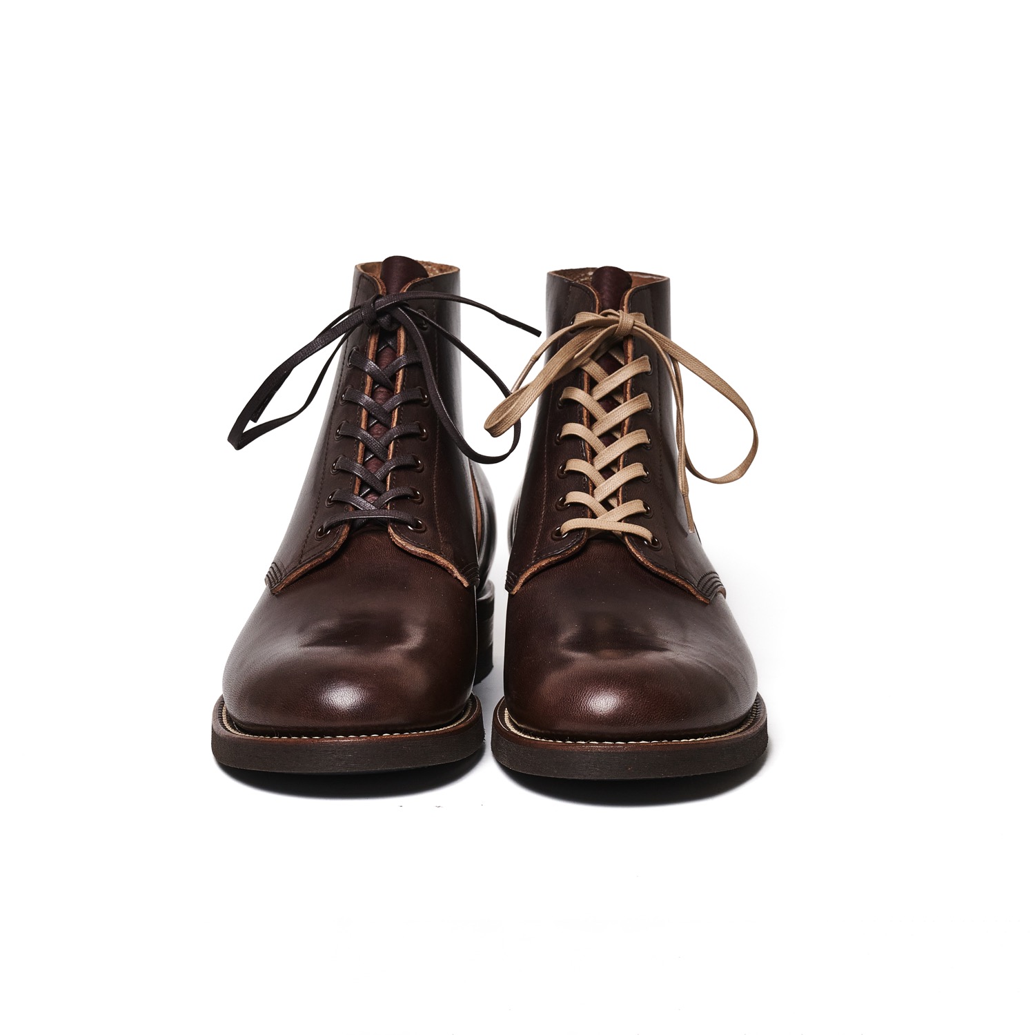 This "M-42.5" Service Boots is created by blending the 2 historical American military boots, M-42 and M43. We tried to mix the best of these 2, shape of Munson last and rather high heel of M-42 and unlined upper and beautiful stitching work from M-43. Picking the best elements of these boots, "M-42.5" comes to have new, original silhouette. We also put the stamp that makes us think if THE BOOTS FACTORY was a contractor of US military. Making a replica of what has never existed, is a paradoxical approach that we take to make this unique boot.