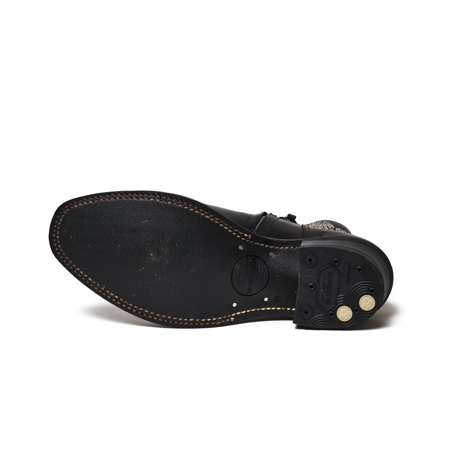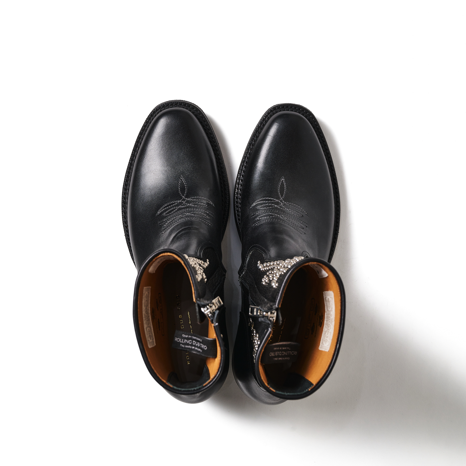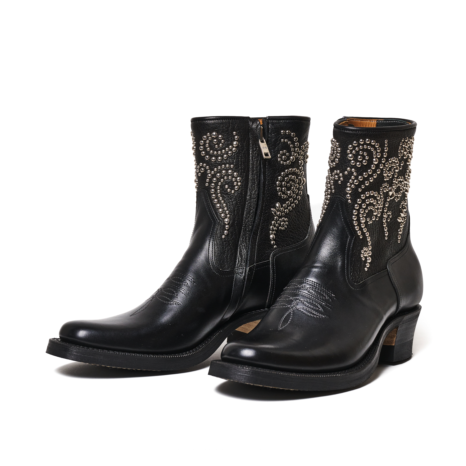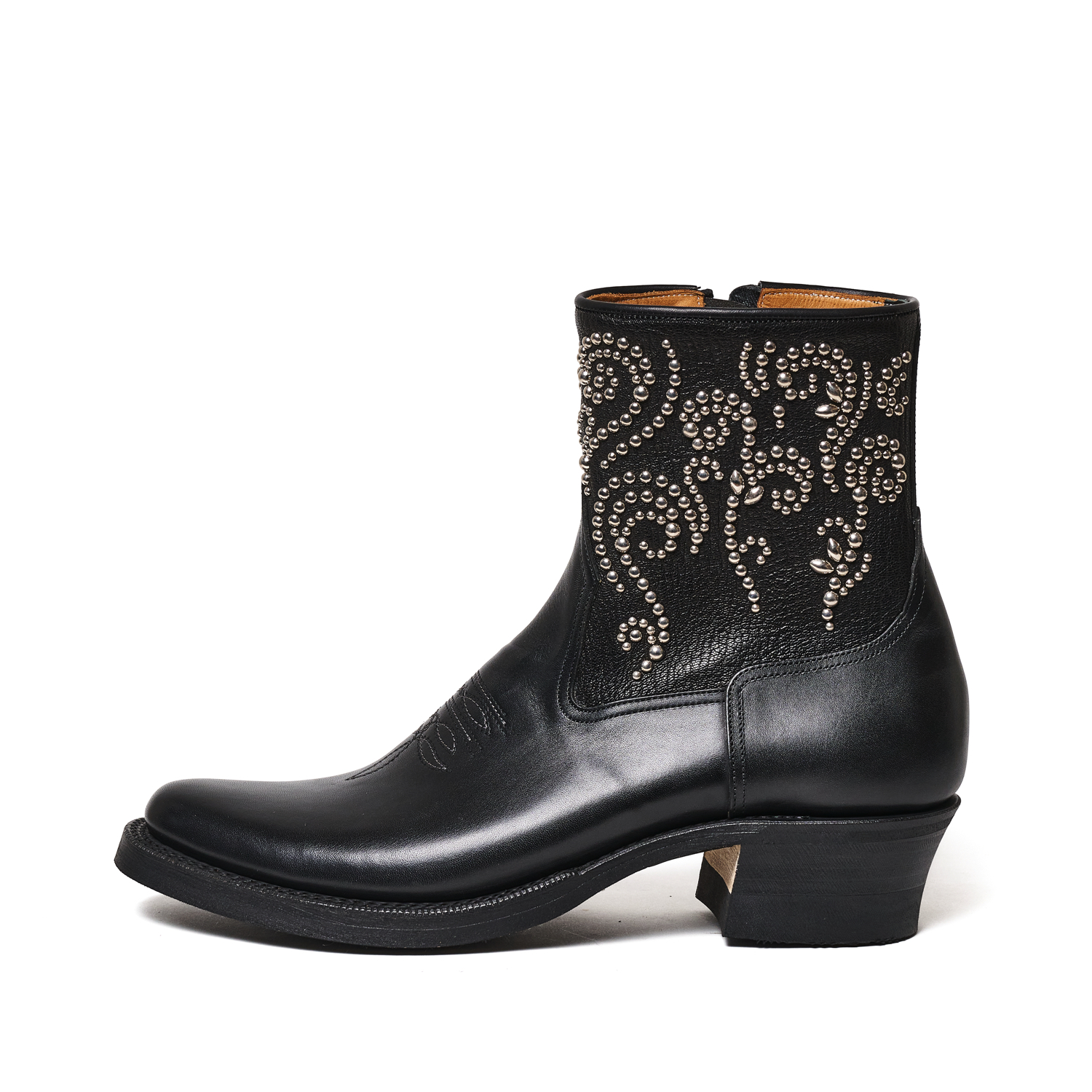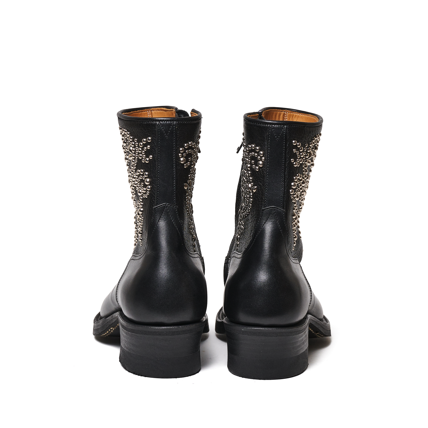 "Loro Zip" is inspired by Western Boot design, but with bold arrangement. Cutting off the shaft, making it as sharp as posssible and adding zip fasteing, the boot now looks minimal and sophisticated. What makes the boot unique and characteristic is the stads that repalced conventional stitching. The stads work is done by "METALJACKET" known as its gracefull, beautiful work and original design. The stads pattern, made by a fusion of "fire pattern" and "bouquet of flowers" goes beyond Western Boot norms and creating harmony that even emcompasses Japanese traditonal beauty.